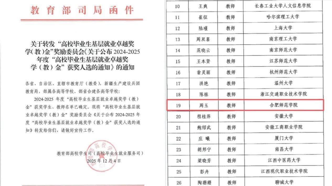 beat365官网辅导员周玉荣获教育部“高校毕业生基层就业卓越奖教金”