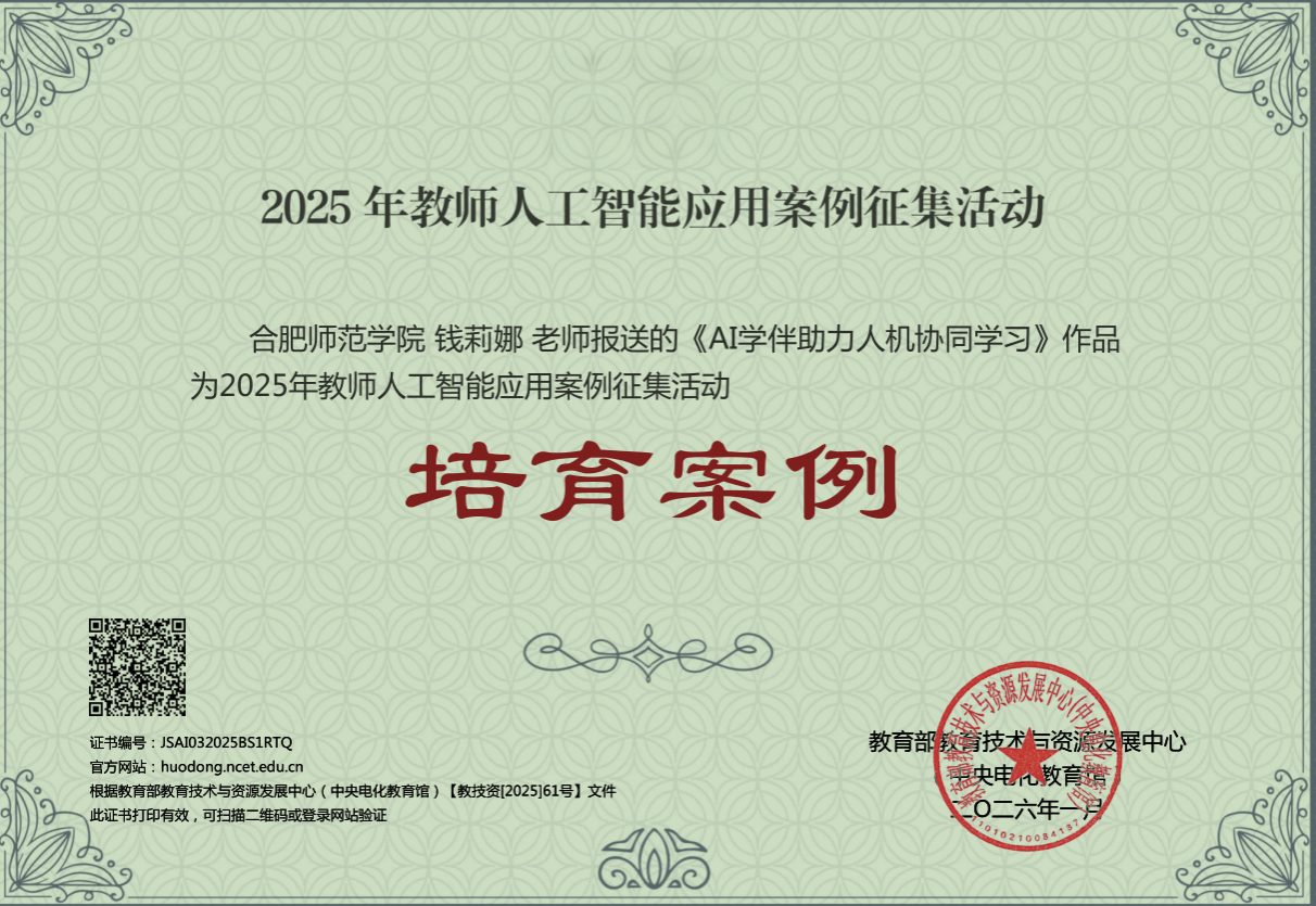 近日,教育部教育技术与资源发展中心(中央电化教育馆)公布《2025年教师人工智能应用案例征集活动结果》(教技资〔2025〕61号),beat365官网外国语学院钱莉娜副教授《AI学伴助力人机协同学习》作品成功入选。