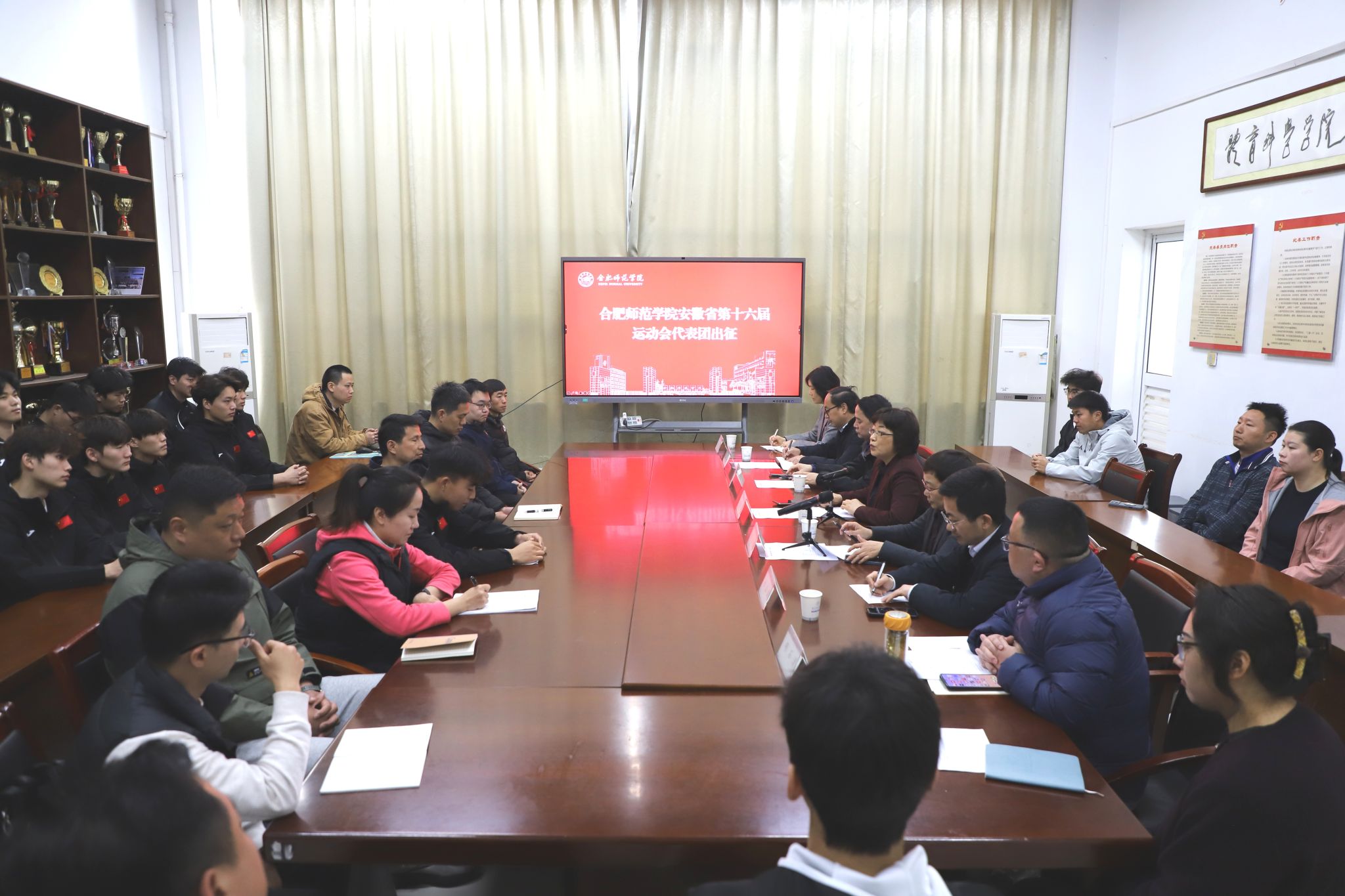 3月27日上午,学校参加安徽省第十六届运动会出征仪式在锦绣校区体育馆会议室举行。校党委书记、校长方东玲出席仪式并作动员讲话,校党委副书记梁立昌主持仪式。宣传部、党政办、学生工作处、体育科学学院党政负责人等参加仪式。排球队全体教练员、运动员及参加省运会的教练员、运动员代表共同参加。