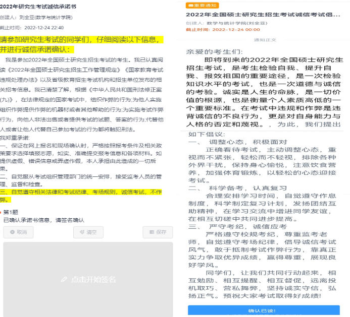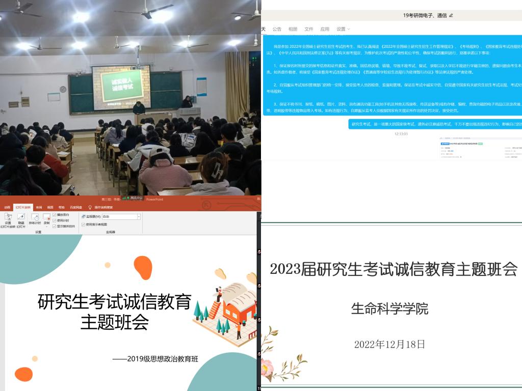 学生工作处印发《关于开展2023年研究生考试诚信教育的通知》,通过开展诚信教育、加强有害信息监控、严肃考试违规处理等方式全面加强研究生考试诚信教育,营造诚信应考的舆论氛围,筑牢诚信考试的法治基础。各二级学院通过线上主题班会、学习小组会议等形式带领考生学习《教育法》《国家教育考试违规处理办法》《普通高等学校招生违规行为处理》以及《beat365中文官方网站学生考试违规处理办法》等相关规定,组织考生签订诚信考试承诺书,引导考生切实增强诚信意识,自觉规范涉考行为,维护研究生考试的公正性和严肃性。