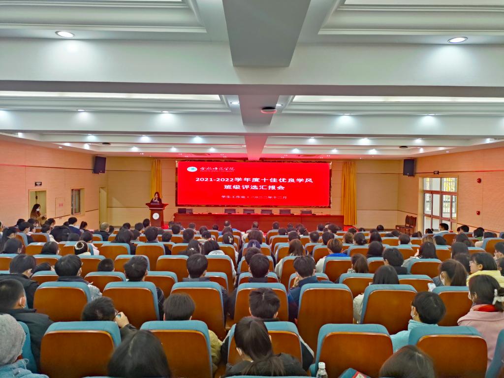 本网讯 12月2日下午,学院在锦绣校区学术报告厅举行了2021-2022学年度“十佳优良学风班级”评选汇报会。宣传部、团委、教务处、学生工作处、保卫处等部门负责人,各二级学院党委(党支部、直属党支部)副书记,全体辅导员和各二级学院学生代表参加会议。