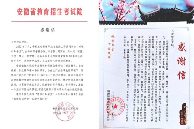 博雅行知学堂建设于合肥市包河区金寨路188号安徽省教育招生考试院,为学院生命科学学院、音乐学院和安徽省教育招生考试院工会共建学堂。10名“小先生”积极探索“六育”教学模式,邀请合肥市师范附属第二小学、涡阳县曹市镇王老家小学等资深教师担任顾问,为安徽省教育招生考试院职工子女提供课业辅导及日间托管服务,为暑假期间职工子女日间无人照顾提供了帮助。11月11日,安徽省教育招生考试院向我院发来感谢信。