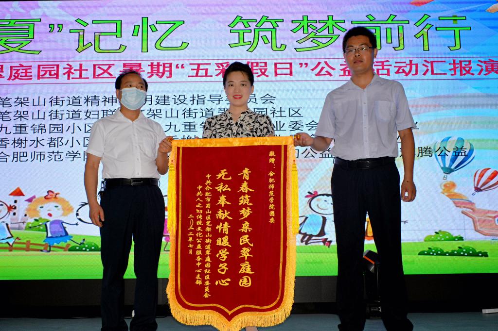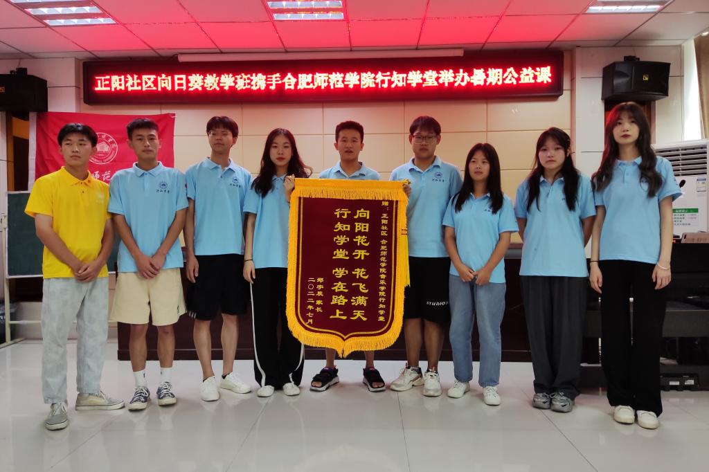 向日葵行知学堂建设于六安市金安区正阳社区正阳街道正阳社区服务站。来自音乐学院的“小先生”依托专业优势,结合小学音乐学校教育特点,向小学员开设音乐常识、歌曲鉴赏、红色歌曲、乐器表演等特色课程,打造青少年喜爱的音乐课堂。7月23日,小学员家长向学堂赠送锦旗。