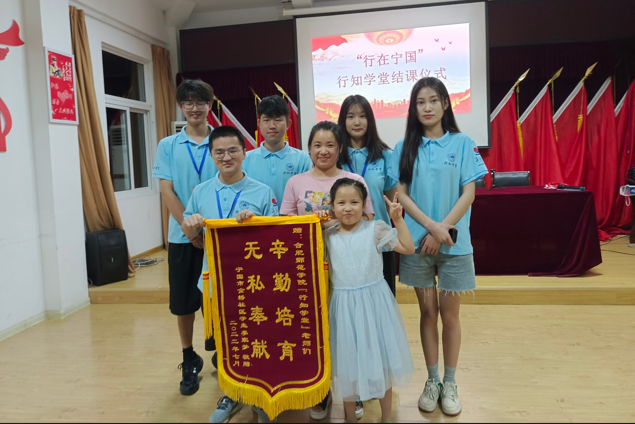 “行在宁国”行知学堂建设于宣城市宁国市金桥社区。学堂以寓教于乐为教学导向,结合小学员所处的学龄阶段和学业水平,围绕爱国主义教育、法治宣传、自然科普等主题,为孩子们开展党史学习教育、手工制作、物理实验、书法绘画等众多特色课程,引导孩子们拓展兴趣领域、学习课外知识。8月1日,小学员及家长向学堂赠送锦旗。