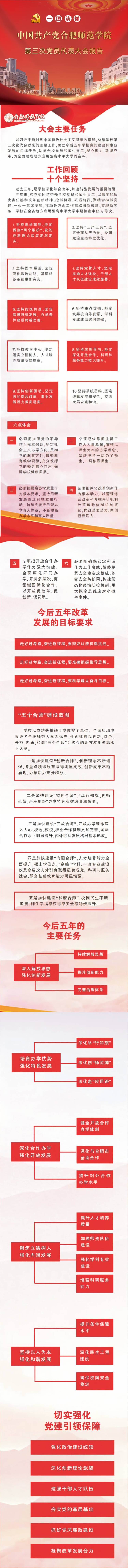 报告全面回顾了学校过去五年所取得的工作成绩,总结了六个方面的发展经验,深入分析了今后五年学校面临的机遇挑战,提出了未来五年发展的指导思想,确立了“以成功获批硕士学位授予单位、全面启动申报更名合肥师范大学为标志,全面建成以创新、特色、开放、内涵、和谐‘五个合师’为核心的地方应用型高水平大学”的奋斗目标。下面,小编带你一图读懂中国共产党beat365中文官方网站第三次党员代表大会报告。
