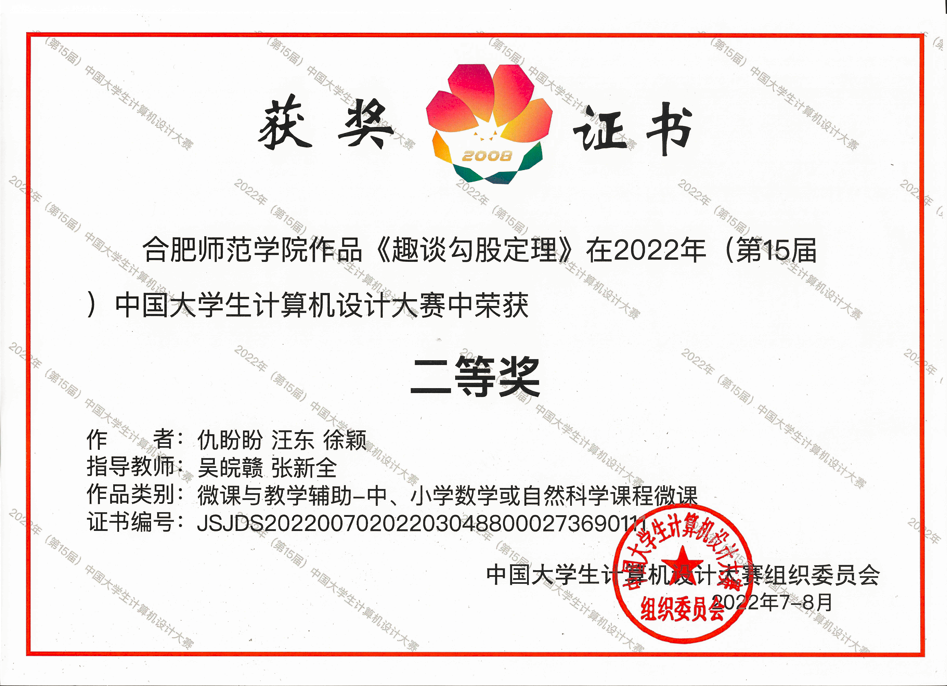 大赛由教务处主办,教师教育学院和艺术传媒学院负责承办。自今年3月份启动校赛以来,学校参赛学生以饱满的热情和最佳的竞技状态全身心地投入比赛,在赛场上沉着冷静、从容自信,奋力拼搏,展现了合师学子强烈的竞争意识和团队精神,真正发挥实力,赛出了自己的特色。经过激烈的角逐,由吴皖赣、张新全老师指导,仇盼盼、汪东、徐颖三位同学完成的微课作品《趣谈勾股定理》和由江慧、吴迪老师指导,程锶璐、王歆睿、王俊杰三位同学完成的微课作品《认识轴对称图形》均荣获微课与教学辅助组国赛二等奖;由吴忠霞、李辉老师指导,刘笑、岳梦云、马凯利三位同学的微课作品《游园不值》荣获微课与辅助教学组省赛一等奖、国赛三等奖;由艺术传媒学院王冬梅老师指导,骆蕊同学的作品《青绿山水》荣获信息可视化设计组国赛三等奖;由马岳、吴胜南老师指导,赵凤莲同学设计的作品《藤本植物信息可视化设计》荣获信息可视化设计组国赛三等奖;由汪中、李彤老师指导,吴磊、马克、胡志豪三位同学的完成的作品《基于轻量级神经网络的烟雾检测应用》荣获人工智能应用组国赛三等奖。