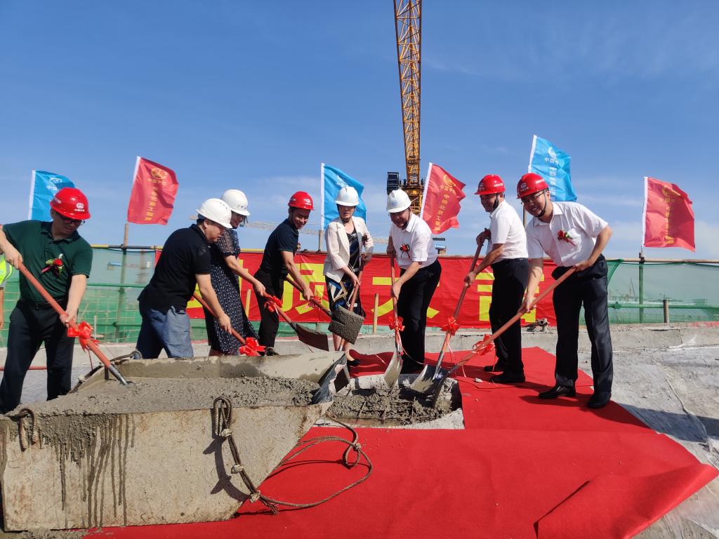 在现场来宾的共同见证下,党委书记徐成钢宣布滨湖校区二期工程封顶,并与来宾共同为项目执锹,加注封顶混凝土。
