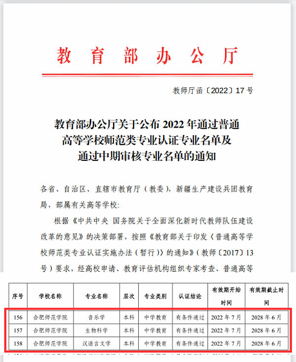 本网讯 近日,教育部办公厅公布了2022年通过普通高等学校师范类专业认证专业名单,我院汉语言文学、音乐学和生物科学3个专业顺利通过师范类专业中学教育第二级认证。目前,我院共有4个师范专业通过教育部师范类专业第二级认证。