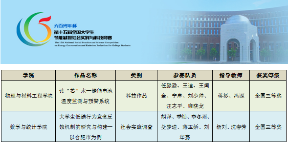 本网讯 日前,“六百光年杯”第十五届全国大学生节能减排社会实践与科技竞赛在天津大学落下帷幕,我院本科生团队的两件作品分别获得全国三等奖,其中蒋杉与冯源老师指导、任淼淼等同学的作品“读‘芯’术—储能电池温度监测与预警系统”获科技作品类三等奖,杨刘与沈春芳老师指导、胡洋等同学的作品“大学生低碳行为意念反馈机制的研究与构建—以合肥市为例”获社会实践调查类三等奖。