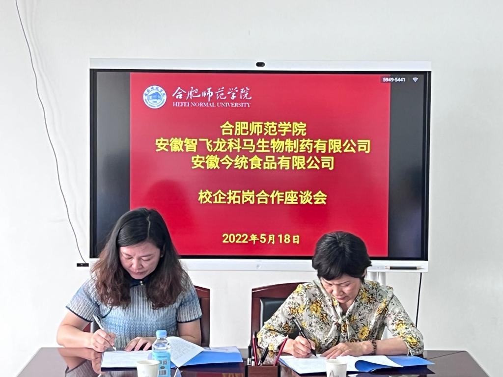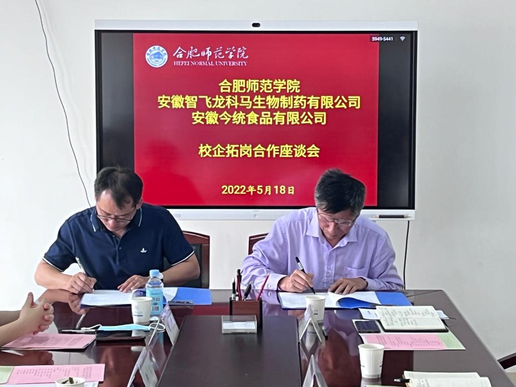 生命科学学院院长徐忠东、党委书记郭桃芬分别与智飞龙科马、今统食品共同签订毕业生就业实习基地合作协议。