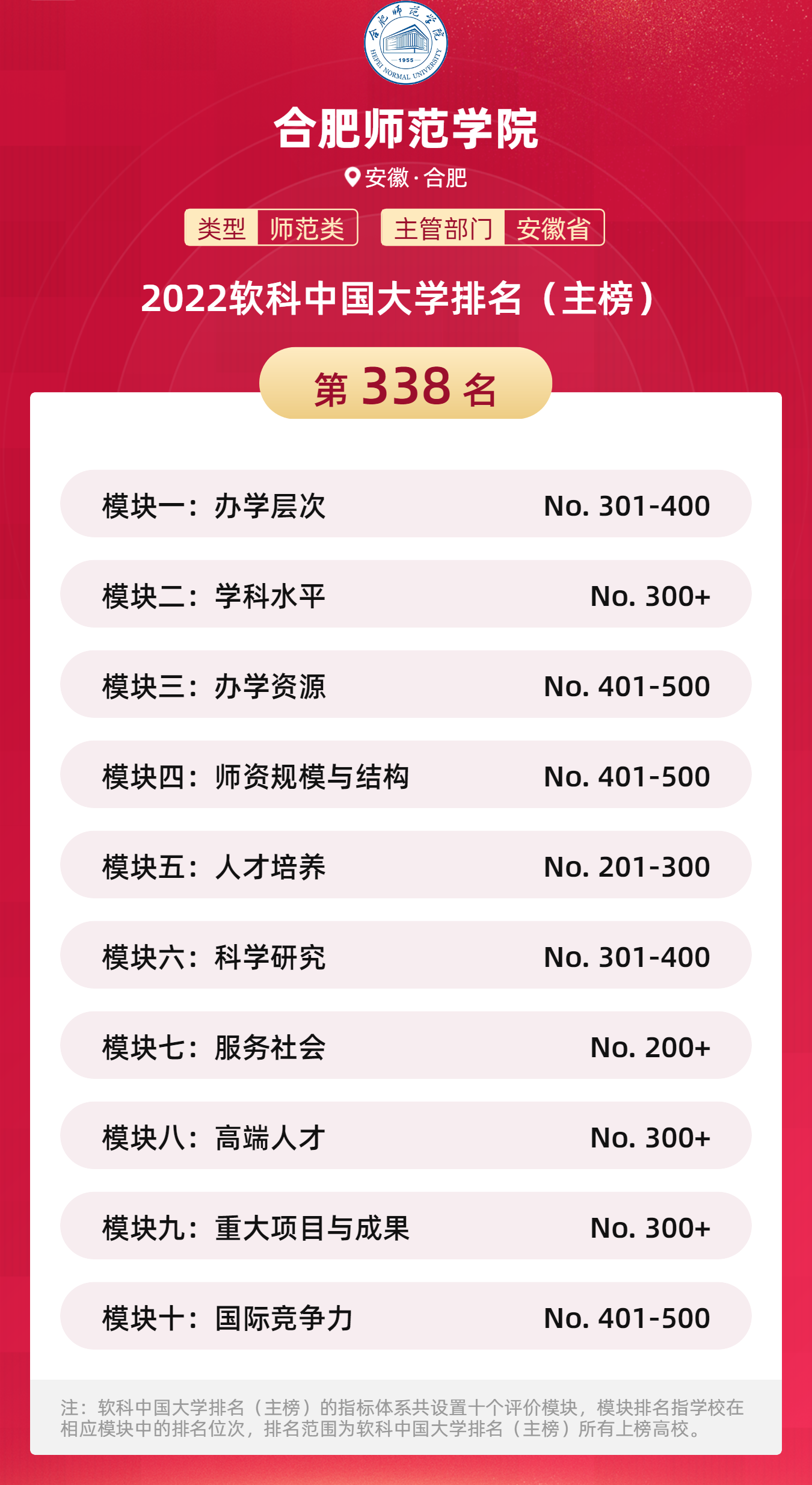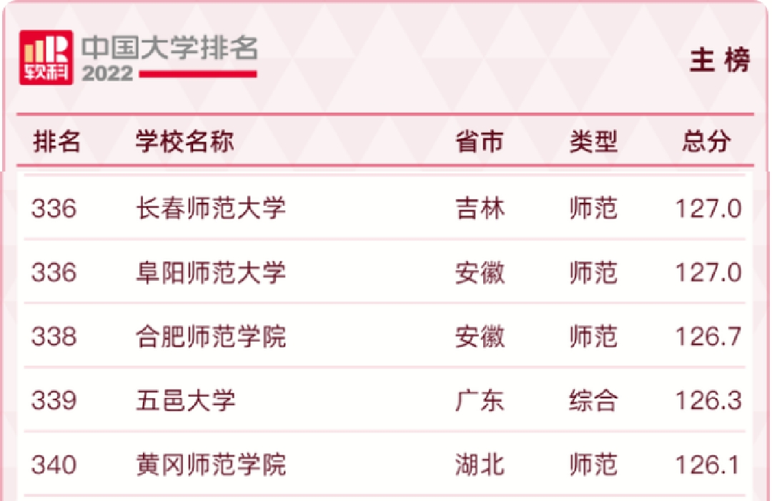 本网讯 近日,高等教育评价专业机构软科正式发布“2022软科中国大学排名”。我院在全国1000多所本科层次的高校中综合排名位列第338位,比2021年排名提升了11位,排名总分从2021年的118.4分增至今年的126.7分,在全国160所师范类高校中排名第58位。