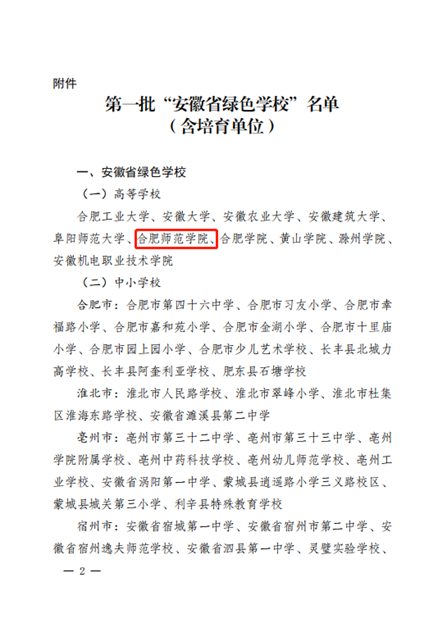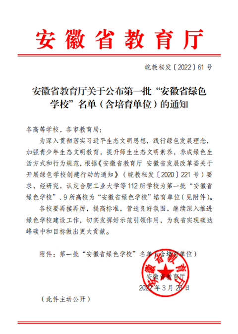 本网讯 3月26日,根据《安徽省教育厅关于公布第一批“安徽省绿色学校”名单(含培育单位)的通知》(皖教秘发〔2022〕61号),安徽省教育厅公布了我省第一批“安徽省绿色学校”名单评审结果,全省仅有10所高校获得评选认定,我院榜上有名。
