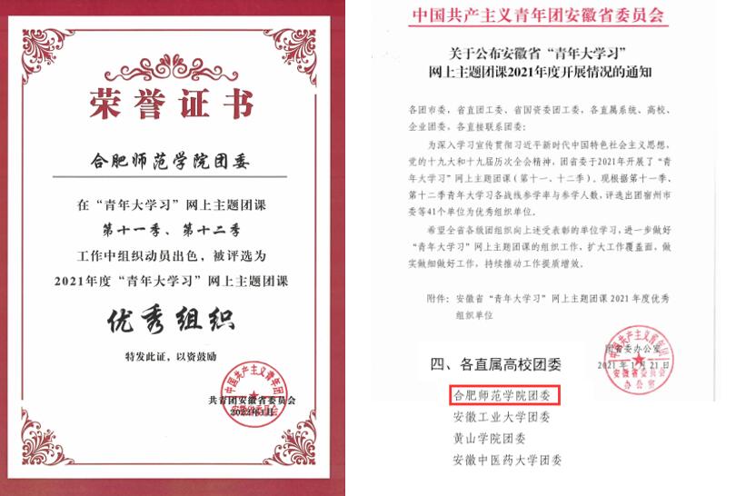 本网讯 近日,团省委公布了安徽省“青年大学习”网上主题团课2021年度开展情况,我院获评安徽省“青年大学习”网上主题团课2021年度优秀组织单位。