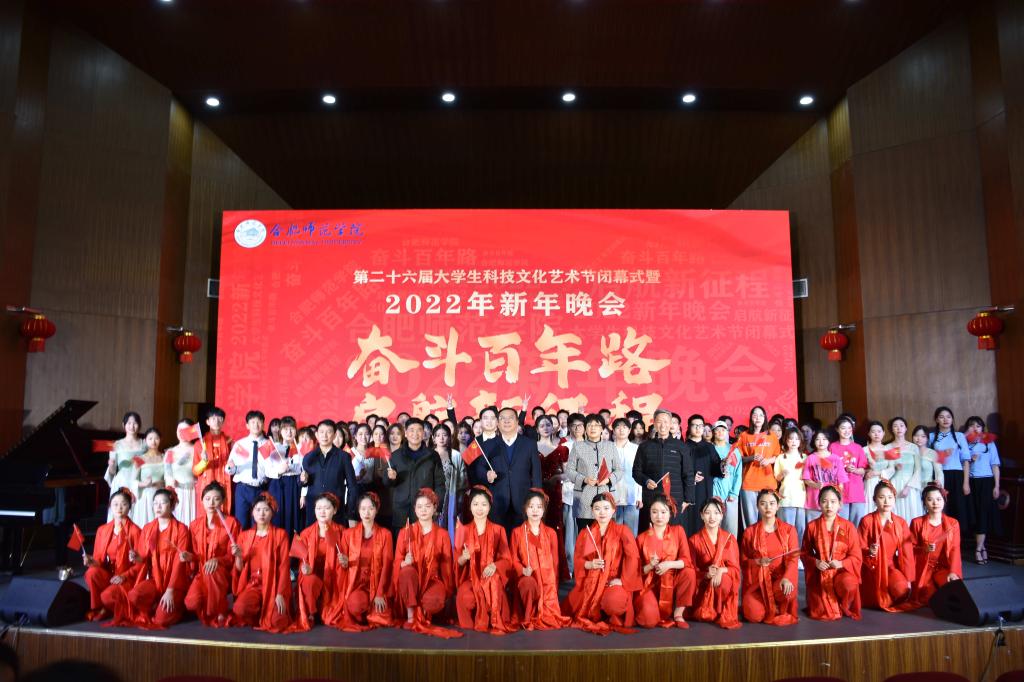 徐成钢代表学院发表了热情洋溢的新年贺词,向一年来勤奋学习、努力工作的全院师生致以美好祝福,向精心组织、积极参与本届科技文化艺术节的老师和同学们致以诚挚问候。他指出,2021年是中国共产党成立100周年,是学院全面开局“十四五”、统筹推进党的建设和事业发展的不平凡之年。一年来,全院上下团结一心、攻坚克难,抓党建、强内涵、促发展。学院广大团学组织和青年学生在在师范专业认证、“行知学堂”、“三优创建”、招生就业等工作和活动中取得了优异成绩,学院获评全国学雷锋志愿服务“四个100”先进典型、中国青年志愿者优秀项目奖、连续第三年蝉联全国暑期“三下乡”社会实践活动优秀单位,毕业生就业率在全省高校名列前茅,体育科学学院李慧茹同学在亚洲赛艇锦标赛女子轻量级单人双桨和双人双桨比赛中摘得两枚金牌等,充分展现了团学组织和广大同学的昂扬风貌。新的一年,学院将以召开第三次党代会为契机,强化党建引领,推动申硕攻坚,建好滨湖校区,加快建设地方应用型高水平大学。他号召全院上下以习近平新时代中国特色社会主义思想为指导,凝心聚力、勇毅前行,以优异成绩迎接党的二十大胜利召开。