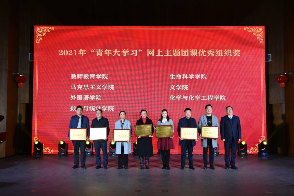 晚会现场,对2021年暑期“行知学堂”实践活动示范行知学堂,2021年“感动合师”十大青年学生,2021年“青年大学习”网上主题团课优秀组织奖,党史学习教育优秀青年学生宣讲员,第二十六届大学生科技文化艺术节优秀组织奖、组织奖、十佳活动等奖项进行了颁奖。