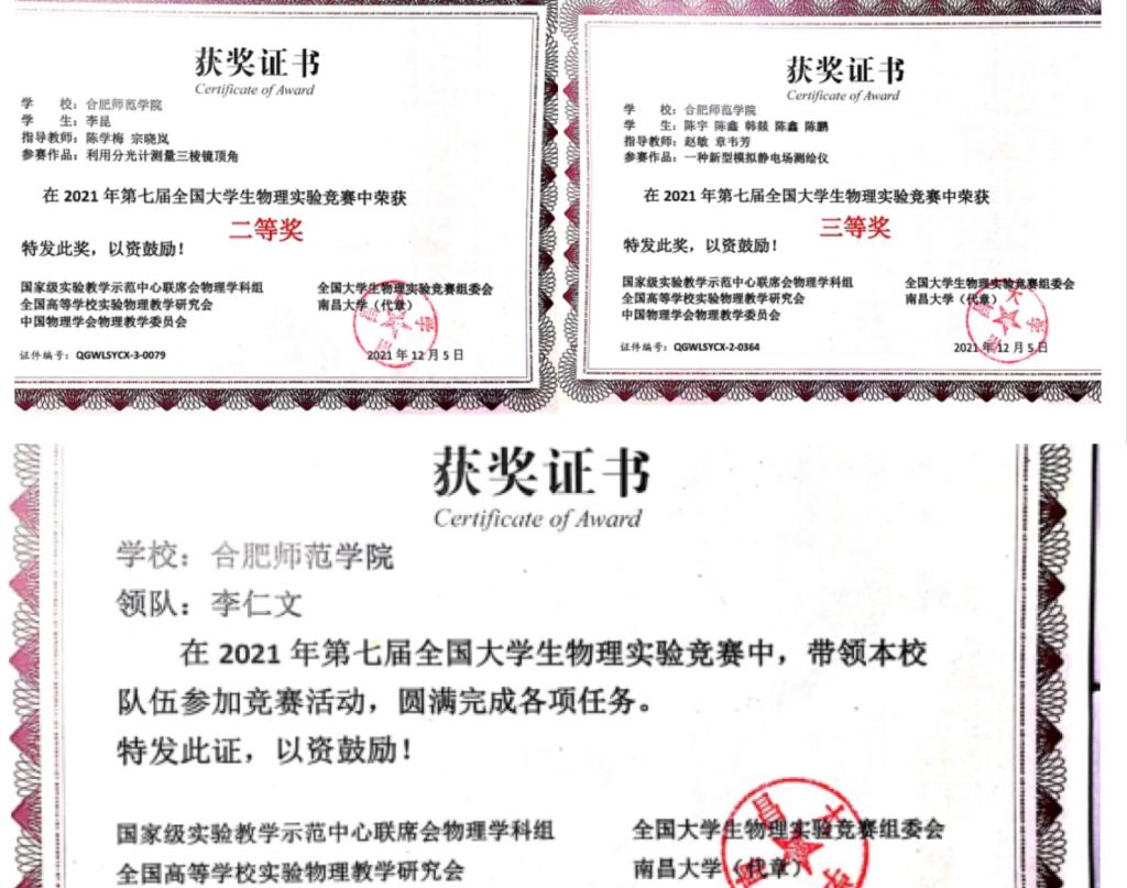 本网讯 近日,由全国大学生物理实验竞赛组委会主办、南昌大学承办的2021年全国大学生物理实验竞赛(创新赛)落下帷幕。我院2019级物理学班李昆同学在陈学梅、宗晓岚两位老师指导下荣获二等奖,2019级物理班陈宇、陈鑫、韩燚、陈鑫(同名)、陈鹏等5位同学在赵敏、章韦芳老师指导下荣获三等奖。领队李仁文老师带领师生积极参加竞赛活动并圆满完成评审任务,获组委会发证鼓励。