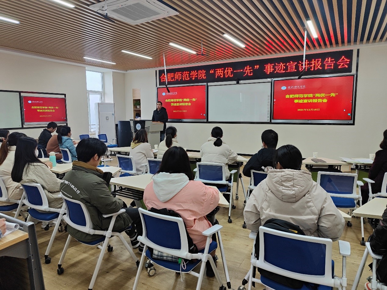 本网讯 为落实高校立德树人根本任务,加强榜样典型的示范引领作用。12月15日下午,校党委宣传部在锦绣校区逸夫楼A502教室举办beat365中文官方网站“两优一先”事迹宣讲报告会。“安徽省高校优秀共产党员”获得者龚晖、张量;“安徽省高校优秀党务工作者”获得者吴世红作宣讲报告,全校辅导员、学生代表共计50人参加了此次宣讲报告会。