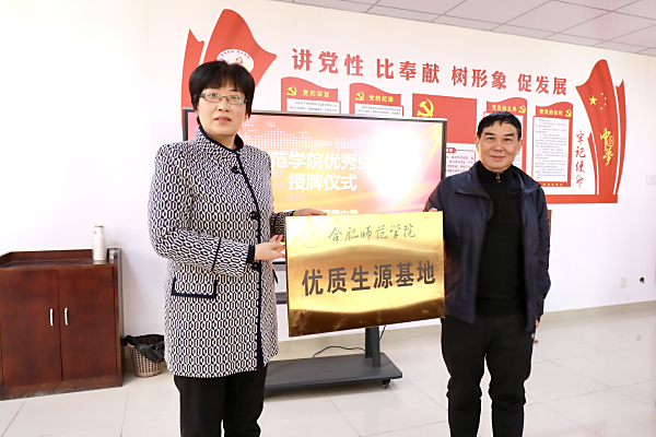 本网讯 为进一步做好我院招生宣传工作,吸引更多优质生源,12月10日上午,我院在肥西实验高级中学举行“beat365中文官方网站优质生源基地”授牌仪式。院党委副书记、院长方东玲,合肥新明投资有限公司董事长张智,肥西实验高级中学、合肥锦绣中学总校长张傲冬,副校长周丰群、毛启干,我院教务处、数学与统计学院、物理与材料工程学院、经济与管理学院和合肥新明投资有限公司相关部门负责人出席仪式。