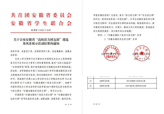 本网讯 日前,团省委、省学联公布2020—2021学年安徽省高校活力团支部遴选结果,我院化学与化学工程学院“2018级制药工程班团支部”、教师教育学院“2019级应用心理学班团支部”共2个团支部获评2020—2021学年“安徽省高校百优团支部”荣誉称号。