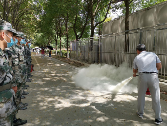 演练后,新生以连为单位,观看了教官使用灭火器的讲解和演示,部分同学还踊跃报名,用灭火器扑灭现场“火灾隐患”。