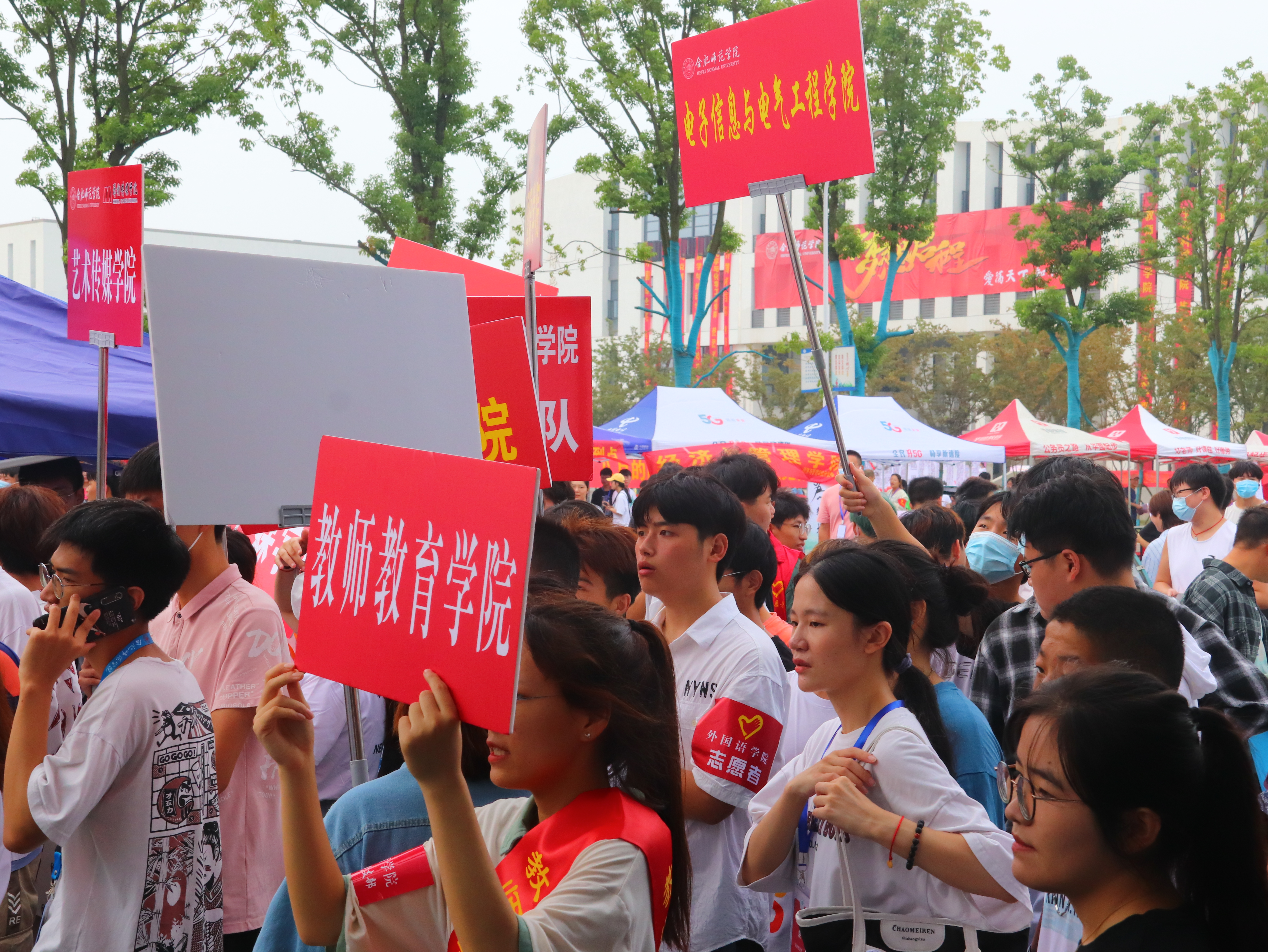 各二级学院在锦绣校区和滨湖校区校园门口设立醒目的新生接待点,志愿者们佩戴各自学院的迎新工作证,在各个接待点等候新生的到来。同时,由校学生会、青年志愿者联合会、“第二课堂”学分认证中心、大学生自律委员会、校新闻中心记者团、校广播台等校级学生组织组成的志愿队伍也活跃在校园各处,共同做好迎新保障工作。