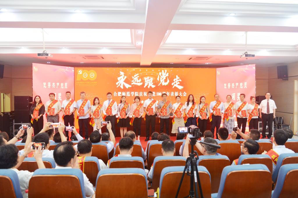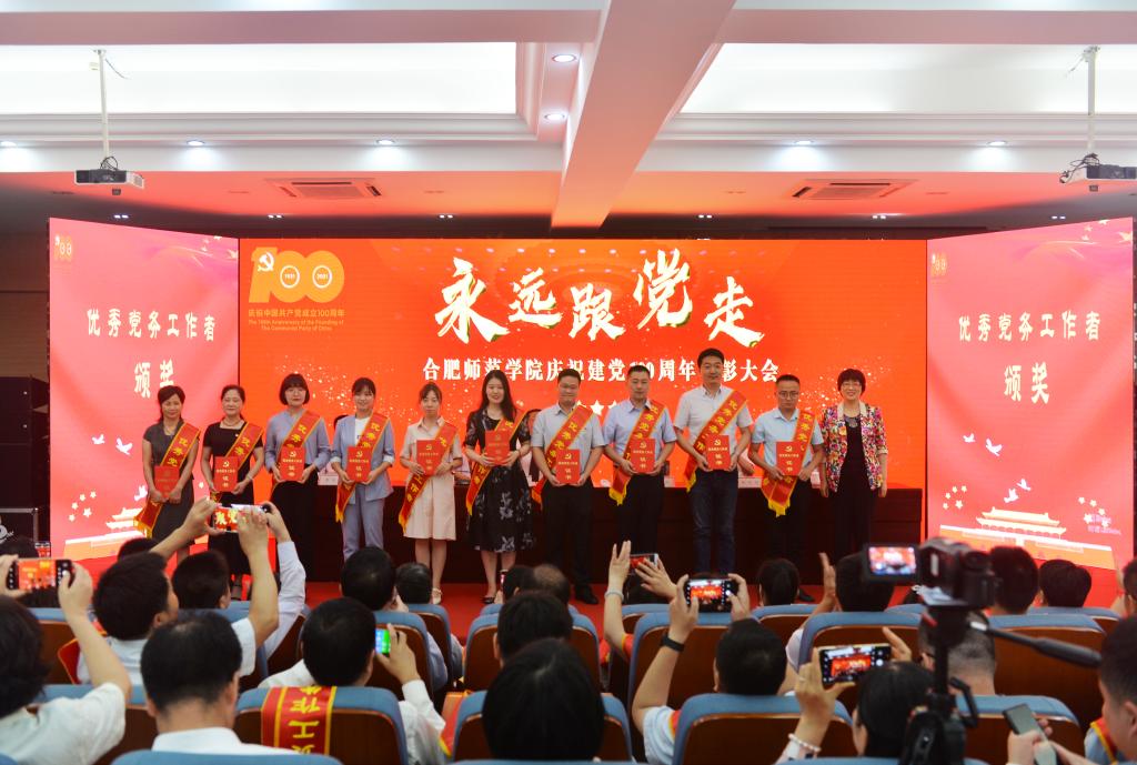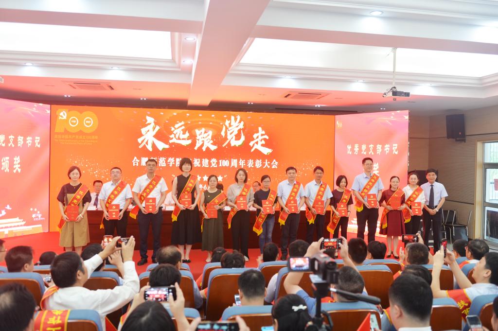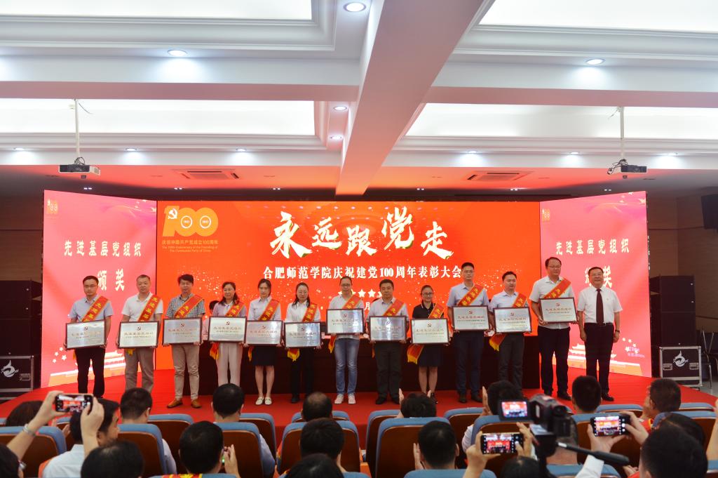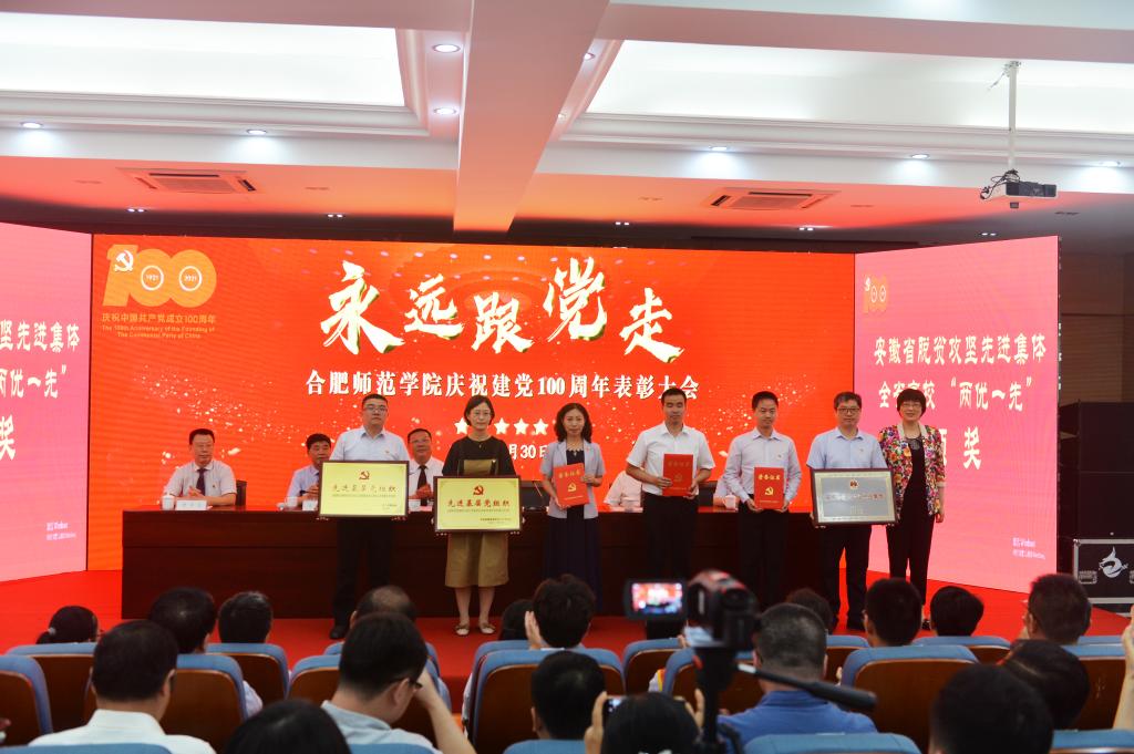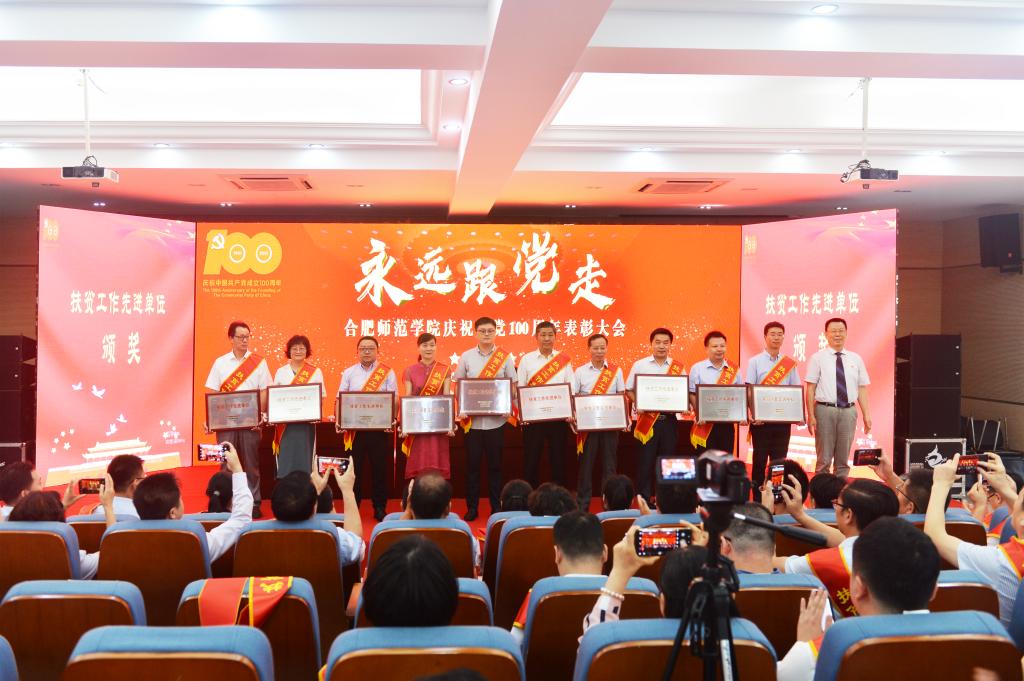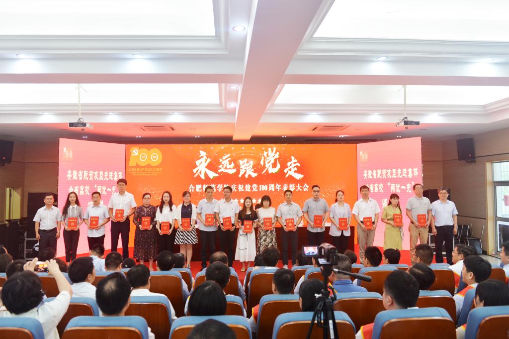 党委副书记吴昕春通报《安徽省脱贫攻坚先进个人和先进集体的决定》《安徽省高校优秀共产党员、优秀党务工作者和先进基层党组织的决定》,宣读学院庆祝建党100周年表彰先进集体和优秀个人的决定以及党建“四好”获奖名单。