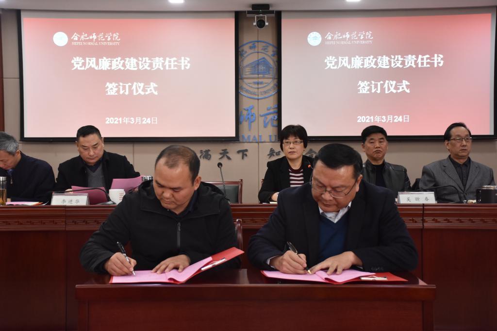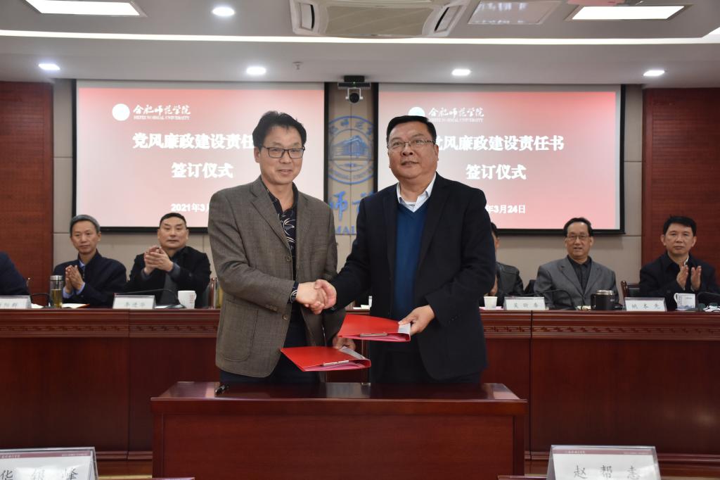 在《党风廉政建设责任书》签订仪式上,徐成钢代表学院党委分别与两位处级干部代表签订责任书。
