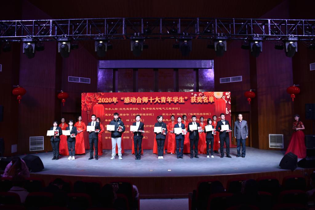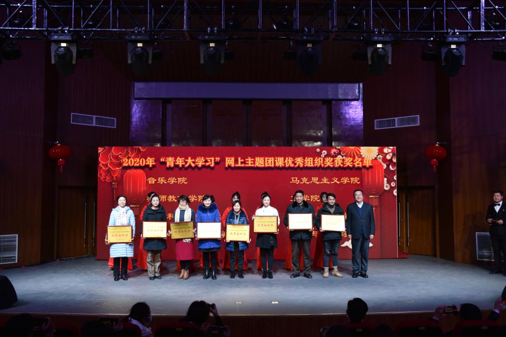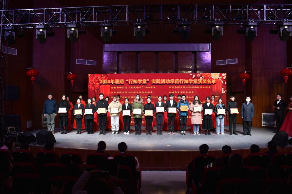 晚会现场,对2020年暑期“行知学堂”实践活动示范行知学堂,2020年“感动合师十大青年学生”,2020年“青年大学习”网上主题团课优秀组织奖,第二十五届大学生科技文化艺术节优秀组织奖、组织奖、十佳活动等奖项进行了颁奖。