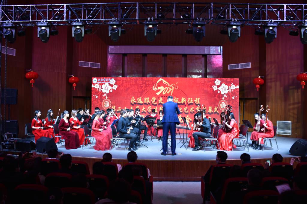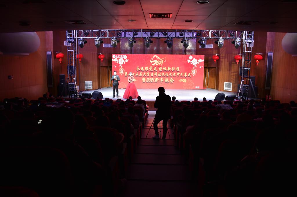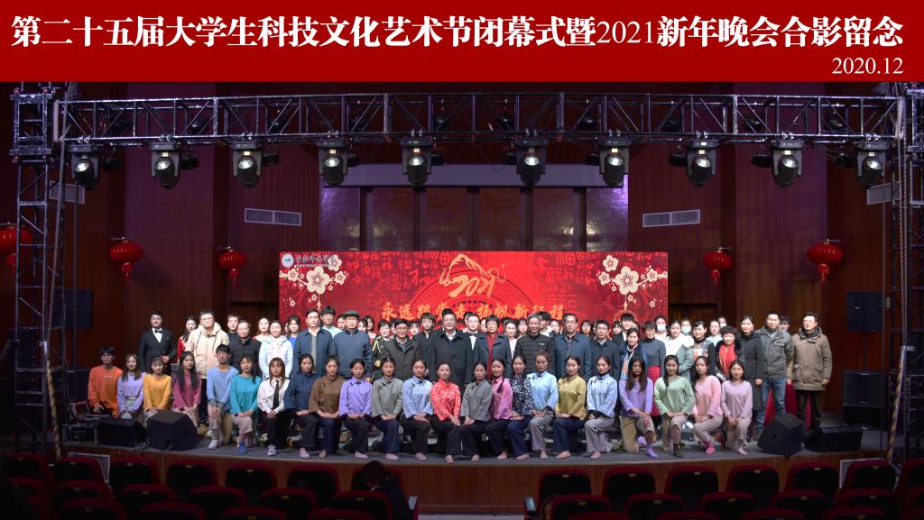 本网讯 12月30日晚,以“永远跟党走,扬帆新征程”为主题的学校第二十五届大学生科技文化艺术节闭幕式暨2021年新年晚会在锦绣校区音乐厅隆重举行。校党委书记徐成钢,党委副书记、校长方东玲,党委副书记吴昕春,副校长谢阳群,副校长姚本先,副校长曹卓良,纪委书记徐文林,学校各单位和部门负责人,各学院分团委书记,全体辅导员及各学院学生代表到场观看晚会。