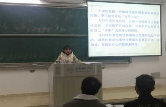 第二专题为“抑郁症的识别、理解与应对”,由教师教育学院魏宏波老师主讲。魏宏波结合丰富的案例介绍了抑郁症在认知、行为、情感等方面的日常表现,详细讲解了抑郁症预防与治疗的措施及自我应对方法。