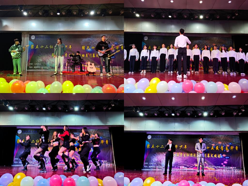 晚会以“聚五十二社风华少年,续六十五载青春华章”为主题拉开序幕。晚会现场,各学生社团各显身手——弦舞吉他社的乐队表演开场火热献唱,激昂的摇滚乐直击人心;大学生英语协会倾情演唱英文歌曲《Edelweiss》,旋律悠扬,婉转动人;大学生艺术团的舞蹈《Waiting for you》一颦一笑,一舞一动,唯美轻柔;艺韵音乐社的歌曲串烧,点燃现场氛围,一曲曲耳熟能详的歌,引起观众共鸣;S.K.Y街舞协会尽情演绎《Pretty &Fancy》,将舞蹈赋予灵魂,曼妙舞姿间散发出不可阻挡的魅力;大学生社交礼仪协会和梨花雨读书社共同带来话剧《母亲的一年》,展示母女情怀,温暖柔情,令人动容;服装设计协会以一曲《青花瓷》让我们领略到中华传统文化的魅力,传统服饰的精美细致惊艳全场……晚会现场座无虚席,伴随着一阵阵掌声,合唱、舞蹈、话剧等10个精彩节目为观众带来一场丰富的视听盛宴。