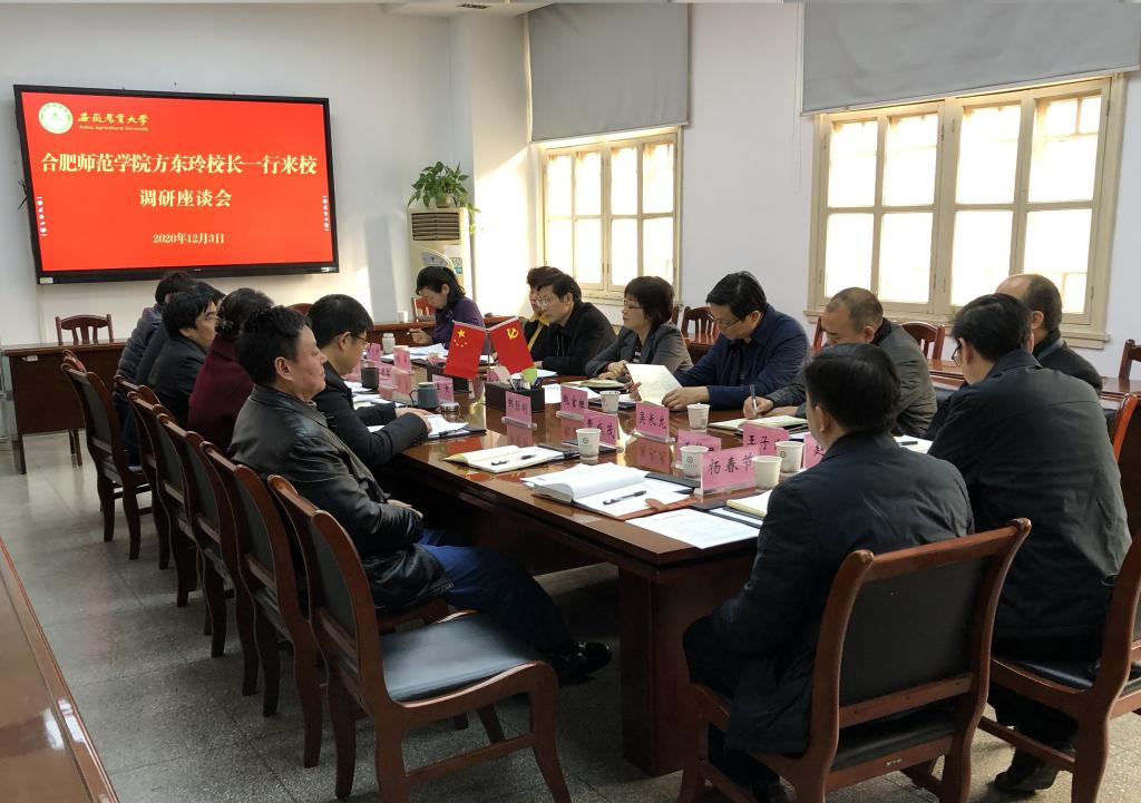 本网讯 12月3日下午,党委副书记、校长方东玲带队赴安徽农业大学学习调研“十四五”规划编制工作,办公室、宣传部、人事处、教务处、科研处、发展规划处、信息技术中心等部门负责人参加调研。安徽农业大学党委常委、副校长李红会见了调研组一行并主持召开调研座谈会。
