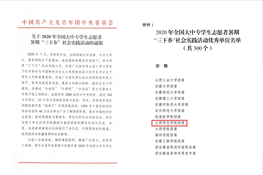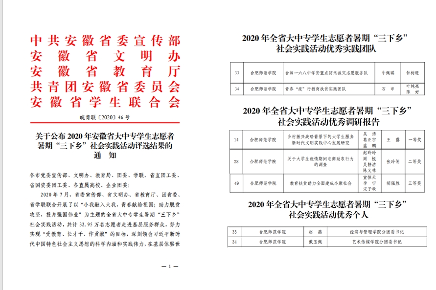 又讯,近日,省委宣传部、省文明办、教育厅、团省委、省学联联合公布了2020年安徽省大中专学生志愿者暑期“三下乡”社会实践活动评选结果,beat365官网获得多项表彰。青年志愿者联合会“合师一六八中学安置点防汛救灾志愿服务队”、文学院“青春‘疫’行教育扶贫实践团队”2支团队获评2020年全省大中专学生志愿者暑期“三下乡”社会实践活动优秀实践团队;经济与管理学院团委书记赵燕、艺术传媒学院团委书记戴玉佩2名教师获评2020年全省大中专学生志愿者暑期“三下乡”社会实践活动优秀个人;3篇调研报告获评2020年全省大中专学生志愿者暑期“三下乡”社会实践活动优秀调研报告。(校团委)