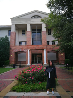 卢荷欣同学在特洛伊大学科学楼前的毕业照