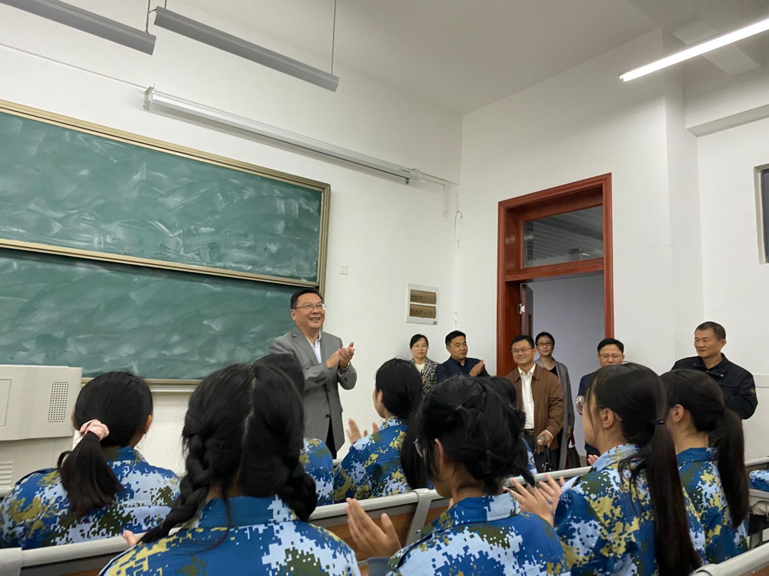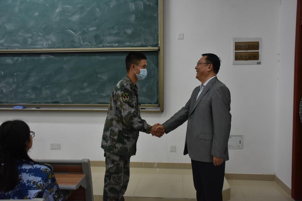 本网讯 10月16日下午,院党委书记徐成钢在宣传部、滨湖办、后勤处、学生工作(部)处等部门负责人和教师教育学院、艺术传媒学院党政负责同志、新生辅导员等陪同下,前往滨湖校区铭传楼A301、A404,看望正在开展室内军训的教师教育学院和艺术传媒学院的新生同学们和军训教官。