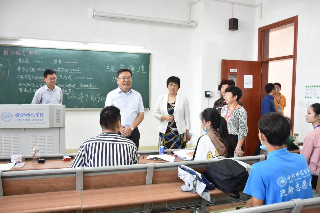 院领导徐成钢、方东玲、李进华、吴昕春、谢阳群、姚本先、曹卓良、徐文林及相关部门负责同志共同到各新生报到点检查指导迎新工作,慰问工作人员和学生志愿者、党员先锋队,走进宿舍看望新生,来到食堂向新生问询饭菜品质。院领导全员出动,全程参与,全方位检查督促迎新报到各个环节运转情况,现场协调解决有关问题。