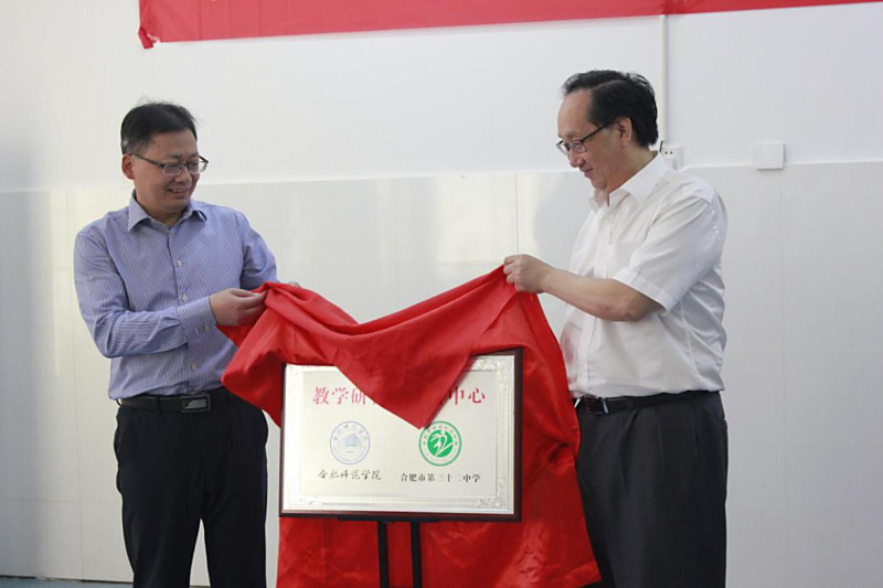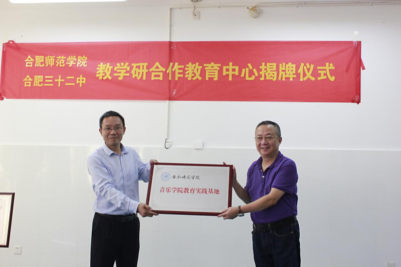 最后,姚本先和徐生彬共同为beat365中文官方网站、合肥市第三十二中学教学研合作教育中心揭牌。音乐学院院长罗可曼与王强共同为beat365中文官方网站音乐学院教育实践基地揭牌。
