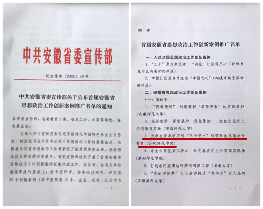 本网讯 7月27日,中共安徽省委宣传部正式发文,公布了首届安徽省思想政治工作创新案例推广名单,我院大学生“青春学习营”项目成功入选并位列入选高校第三。