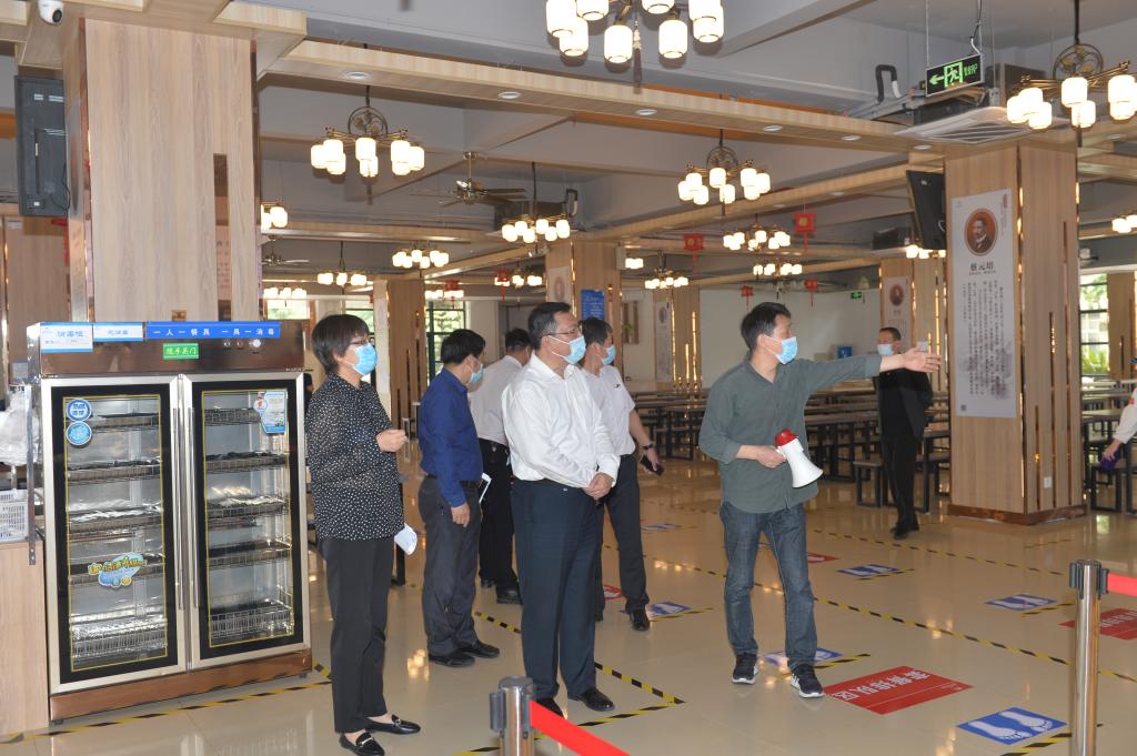 本网讯 学院2020年春季学期第一批次学生即将返校,为进一步提高疫情防控和应急处置能力,确保师生和校园公共卫生安全到位,根据学校疫情防控工作总体安排,5月15上午,学院组织开展学生返校准备工作大巡查。院疫情防控工作领导小组组长、党委书记徐成钢,党委副书记、院长方东玲,疫情防控工作领导小组副组长、院领导李进华、吴昕春、谢阳群、姚本先、曹卓良、徐文林深入锦绣校区,全面检查学生返校各环节准备工作。院疫情防控工作领导小组各成员单位主要负责同志参加检查。