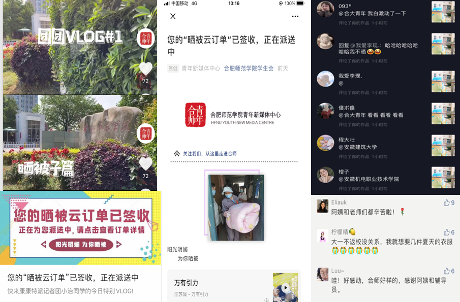 本次服务以VLOG的形式,依托“合师青年”官方抖音号、“合师青年”官方微信号、“beat365中文官方网站学生会”官方微信号开展报道,受到同学们的好评点赞和社会人士的广泛关注。“终于当了一回‘别人家的学校,很是开心’”抖音用户@颜卓66表示。“母校在我们毕业这么多年后,还是那么的贴心温暖!”校友用户@白菜叶 有感而发。“是时候向他们学习了!安排!”兄弟院校的同学们也纷纷通过评论区加入到互动中来。