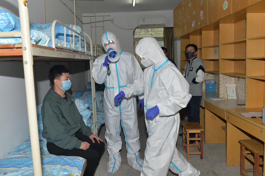 场景二由11名辅导员参演,呈现了日常管理中学生返回宿舍流程、宿舍出现体温异常学生进行报告、校医院医务人员上门诊疗并转介定点医院、同宿舍同学送到校内隔离观察点、学生信息逐级上报的全过程。后勤处副处长李建礼就学生在宿舍发热应急处置规范和流程进行汇报。