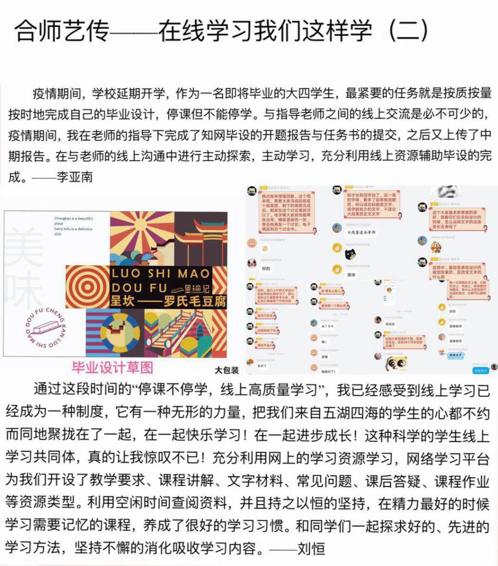 诸如,第三个一为“共享一种收获”:重视共同学习、实现共同进步,发挥在线学习制度优势,转化为学习力量。重点突出了“分享、传递、转化”的线上学习方式,即为“突出分享学习实践,传递学习经验,转化学习行为”,并结合学院办好“合师艺传—在线教学我们这样教”和“合师艺传—在线学习我们这样学”电子专栏。协同专业课老师和学院实践教研室,协同教师党支部党员,编辑“合师艺传—在线学习我们这样学”电子专栏文稿,通过线上班会、班级QQ群、学院官网、学院微信公众号等途径,进行广泛宣传,加强交流学习经验实践,形成优势互补,达到资源共享,相互学习、相互交流、相互促进、共同提高的目的。(艺术传媒学院:史娌娇、张引)