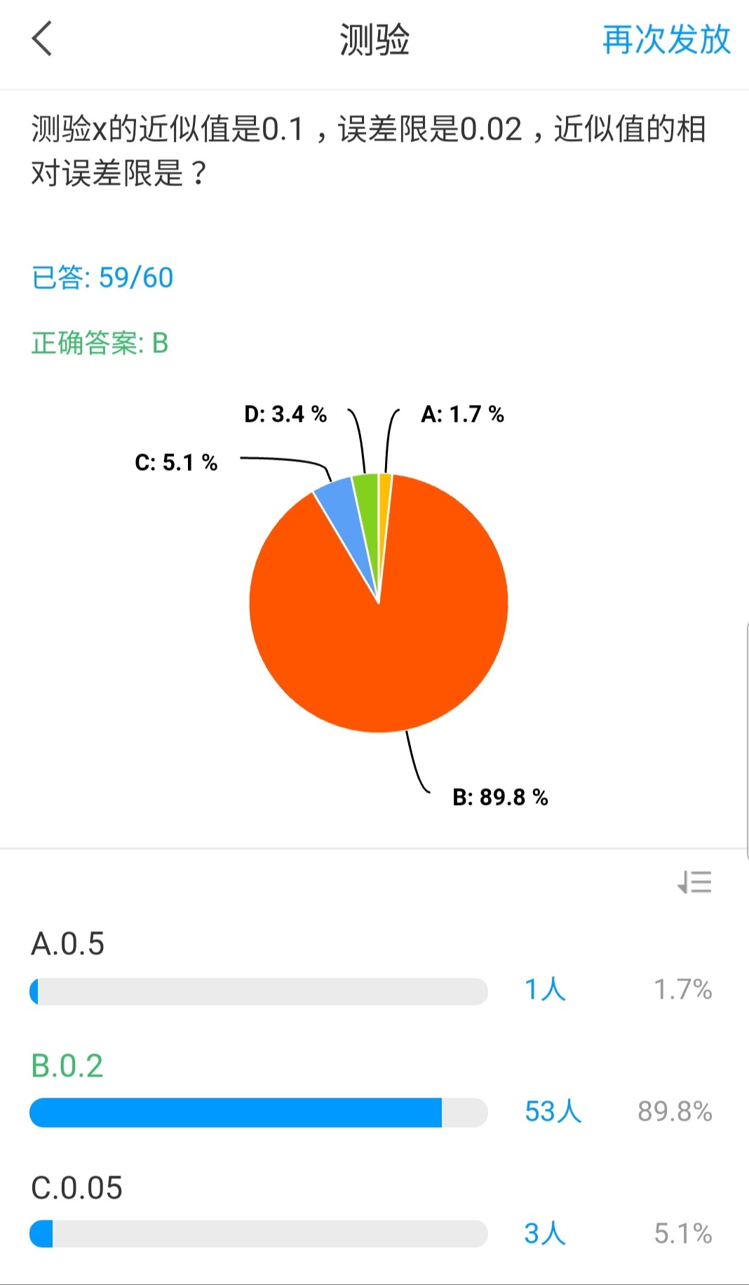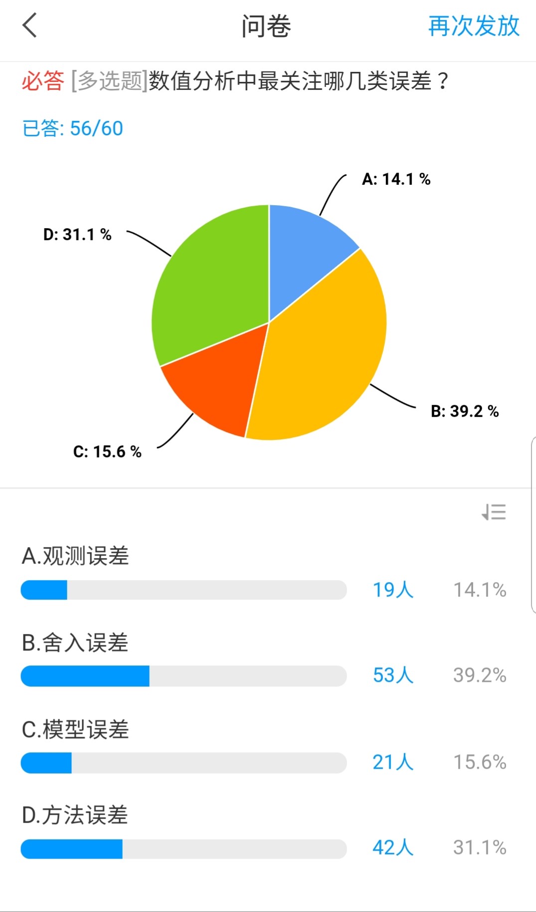 我采用的是课程录播和直播的混合教学模式。由于课程库里《数值分析》课程资源不多,且理论课时仅32学时,超星泛雅课程教学平台中没有特别合适课程可直接用于课堂教学。再加上全国学校都在进行网上教学,正常上课时间不能保证所选平台网络实时通畅,所以不能仅仅依靠直播来进行网上教学。此外,直播较考验学生的自制力,若没有跟上课堂的节奏,像数学这样的课程就难以继续下去。所以课程录播环节不能缺少,而且要提前上传课程网站,以便学生自主学习,之后回看。直播时我利用QQ群中的是屏幕分享功能,网络实时性好,而且可以结合白板进行演算。直播中的课堂互动选择在“学习通”中完成,如“选人操作”完成后,让选到的同学在直播群里回答问题,完成后根据回答情况在“学习通”里给学生加分。录播一般会提前上传到“学习通”,学生可以提前学习,直播时通过课堂互动掌握学生的学习情况,这种混合教学模式,有助于提高课堂效率。我将录播的课程视频设置为任务点,课程平台会自动根据学生的学习时长算入平时成绩,课堂活动中的参与得分反应了学生在课程学习中投入的精力和时间,也会被系统记入平时成绩中,通过这样的平时成绩统计方式激励学生自主学习,在一定程度上提高了学生的学习主动性和积极性。