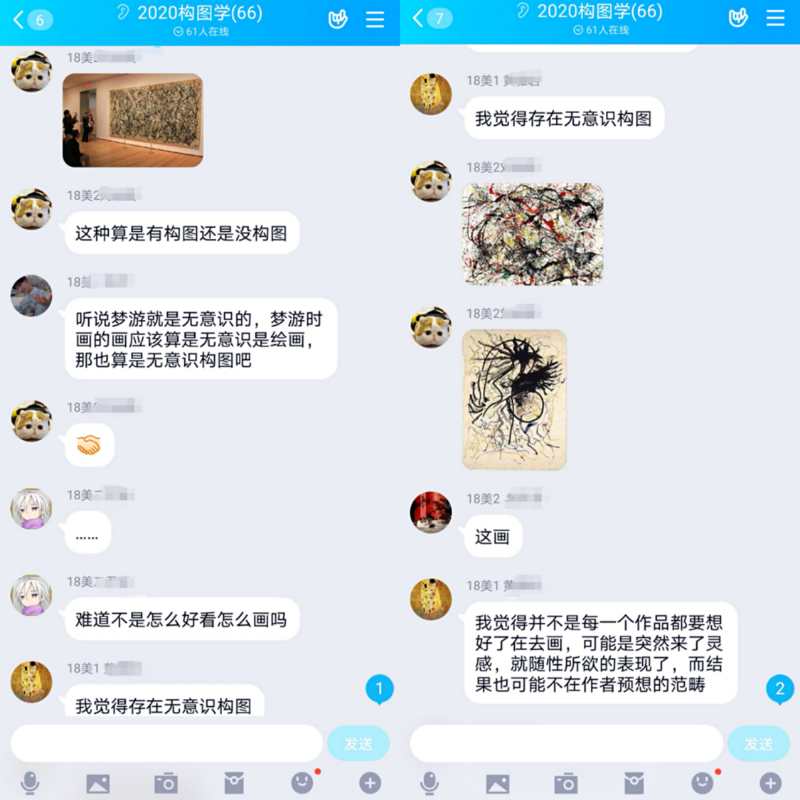 此外,我还找到了艺术课程教学的新途径。师生可以通过截图、拍照、标注等方式发送到网上,及时开展“合作学习”,而截图拍照实际上也锻炼了学生的美术技能,实现了“学以致用”的效果。课堂讨论中的精彩分享和激烈辩论被截屏留存下来,也将成为学生们后续进行艺术创作、毕业论文创作的参考素材。