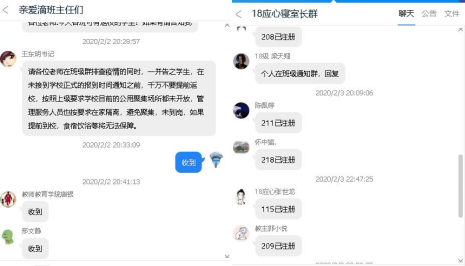 疫情就是命令,防控、抗疫刻不容缓。在疫情面前,学生权益放在第一位,为此,教师教育学院立即部署,一手抓学生防护教育无遗漏,一手抓远程教学不停学。学院以包保责任制为依托,借助辅导猫、群聊等网络群组迅速部署网格化管理,第一时间形成由学院党政—学工队伍—学生骨干—学生—家长组成的管理模式,及时有效传达教育厅、学校各项战疫通知和要求,双通路顺畅掌握学生身心动态。