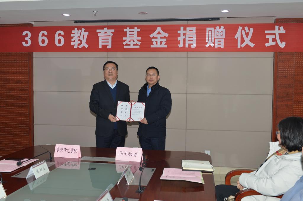 8日下午,学院在锦绣校区行知楼2008会议室隆重举行了“366教育基金捐赠仪式”。院党委书记徐成钢,党委副书记、院长孙道胜,副院长姚本先,366教育投资有限公司董事长周扬海校友,以及在该公司工作的我院英语、物理、数学等专业校友胡义胜、徐国庆、周星、程墨、胡邓南等共同出席了捐赠仪式。院发展规划处(校友办)、教务处、办公室、科研处、财务处、国际合作与交流处、外国语学院、物理与材料工程学院、数学与统计学院等单位负责人和教师代表参加了捐赠仪式。捐赠仪式由孙道胜主持。