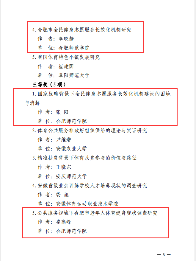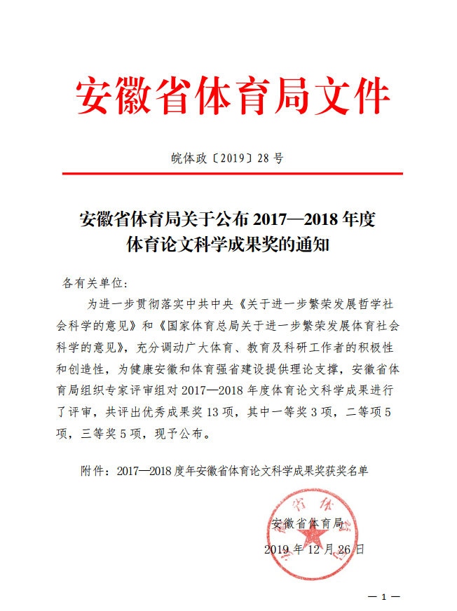 本网讯 12月27日,《安徽省体育局关于公布2017—2018年度体育论文科学成果奖的通知》(皖体政〔2019〕28 号)发布,经专家组评审,共评审出优秀成果奖13项,beat365官网体育科学学院共有5项成果获评优秀成果奖,其中一等奖1项,二等奖2项,三等奖2项。