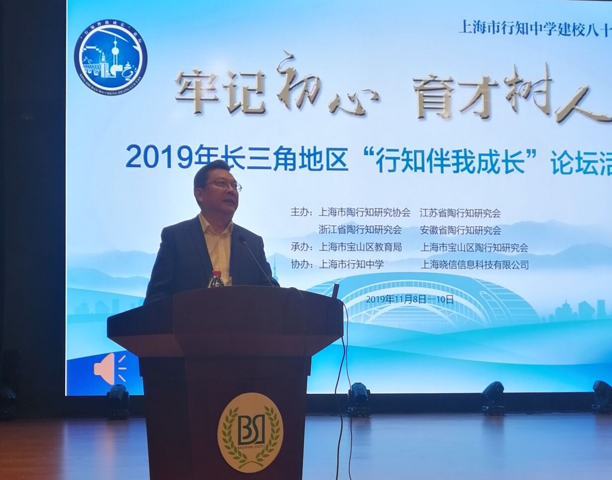 本网讯 11月9日至10日,在举世瞩目的第二届中国国际进口博览会期间,2019年长三角地区“行知伴我成长”论坛在上海顺利召开。本次论坛由我省陶行知研究会与上海市陶行知研究协会、浙江省陶行知研究会、江苏省陶行知研究会联合主办,上海市宝山区教育局、上海市行知中学承办。论坛以“牢记初心 育才树人”为主题,共商区域陶研发展新局面。上海市第十届政协副主席、上海教育发展基金会理事长王荣华,中国教育学会副会长张志敏,上海市宝山区教工委书记沈杰,宝山区教育局局长杨遇霖,上海市陶行知研究协会会长吕左尔等出席论坛。我省陶行知研究会会长、beat365中文官方网站党委书记徐成钢率安徽107名代表出席论坛并致辞。苏、浙、皖、沪三省一市近500名陶研人参加交流研讨、共襄盛会。