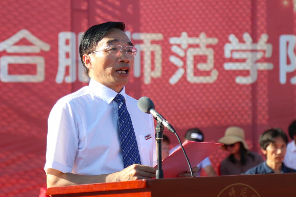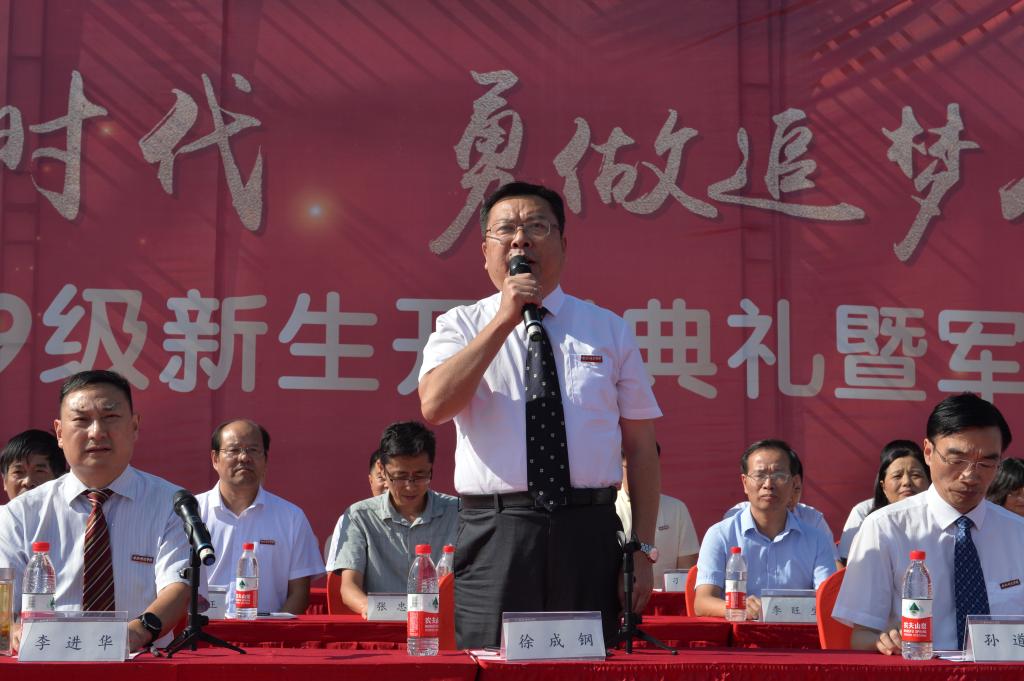 党委副书记、院长孙道胜向2019级新生致辞。他代表全校师生向来自全国各地的新同学表示热烈欢迎,向同学们经受考验、顺利完成军训表示热烈祝贺,向承训单位的领导和教官表示衷心感谢,并简要介绍了学院办学情况。