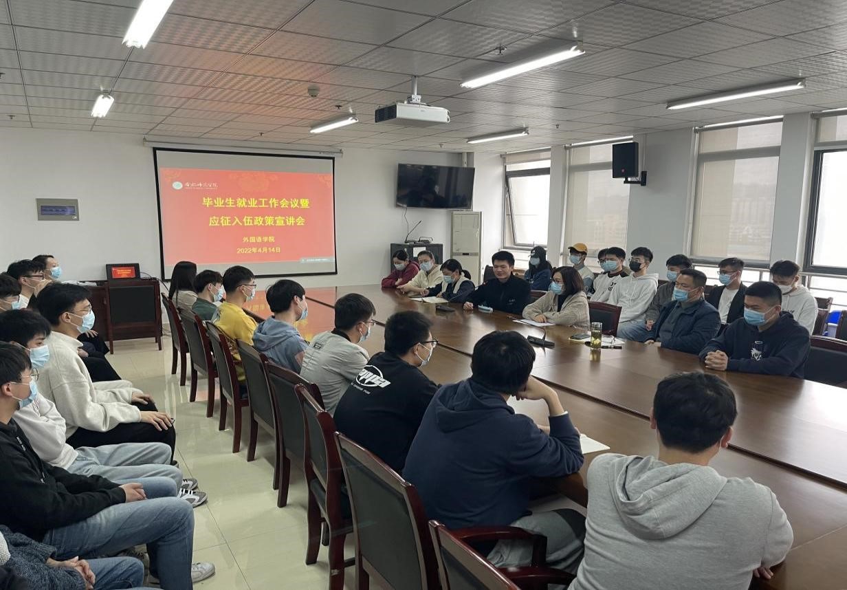 本网讯 为鼓励大学生积极应征入伍,进一步提高大学生参军报国的热情,4月14日下午,外国语学院在行知楼1002会议室召开毕业生就业暨新兵入伍政策宣讲会。本次宣讲会邀请了学校保卫处人武部的钟洁老师为同学们进行宣讲,外国语学院党委书记马四民、毕业班辅导员、退役复学学生、毕业班学生及有参军意愿的同学参加了本次活动。